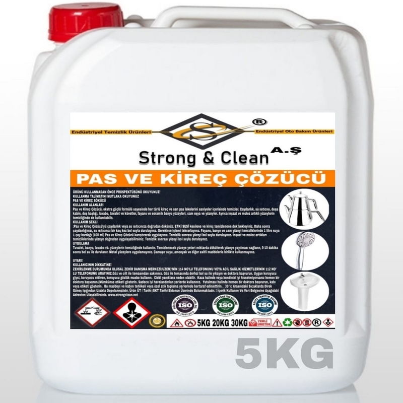 Pas ve Kireç Çözücü, ekstra güçlü formülü sayesinde her türlü kireç ve sarı pas lekelerini saniyeler içerisinde temizler. Çaydanlık, su ısıtıcısı, duşa kabin, duş başlığı, lavabo, tuvalet ve küvetler, fayans ve seramik banyo yüzeyleri, cam eşya ve yüzeyler. Ayrıca inşaat ve moloz artıklı yüzeylerin temizliğinde de kullanılabilir.